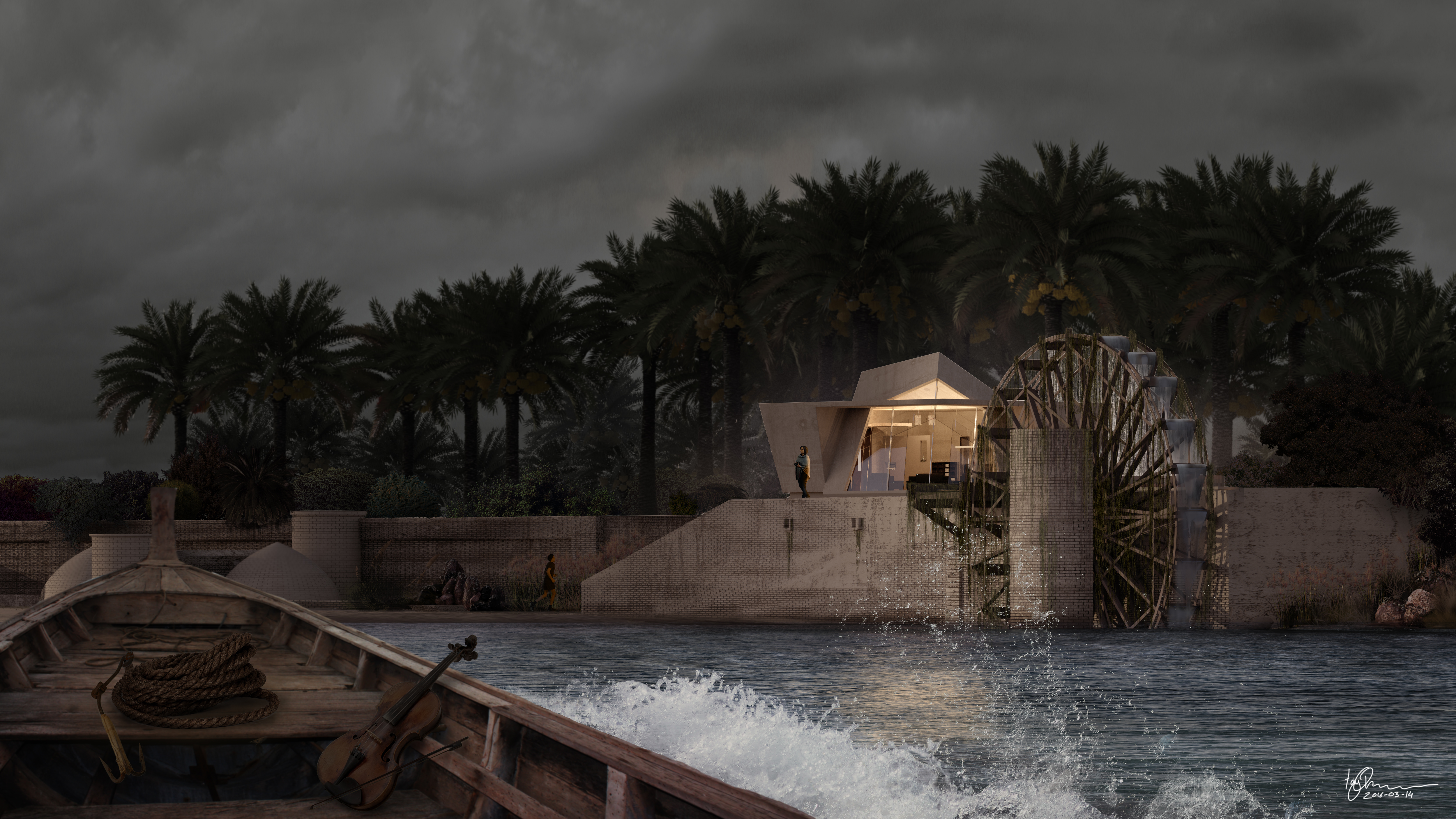 A weekend house in the banks of the Tigris River, this house is tightly connected to the nature, it flows with the water a tilted cube facing a landmark and hiding between palm trees, the waterwheel works passively delivering water to the outdoor pool.