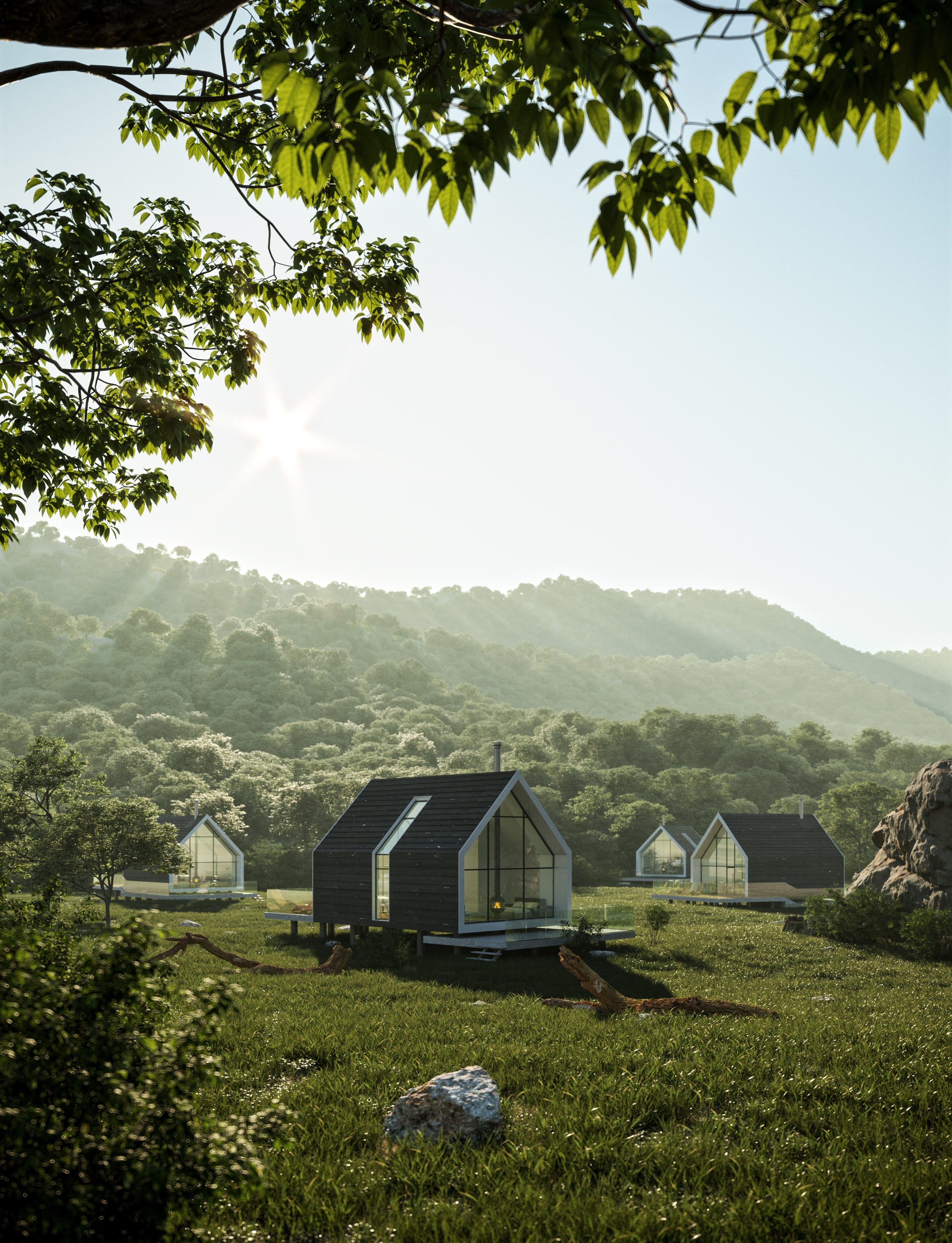 The goal was to come up with a simple and modern design for camping houses placed in a large secluded environment in the mountains.