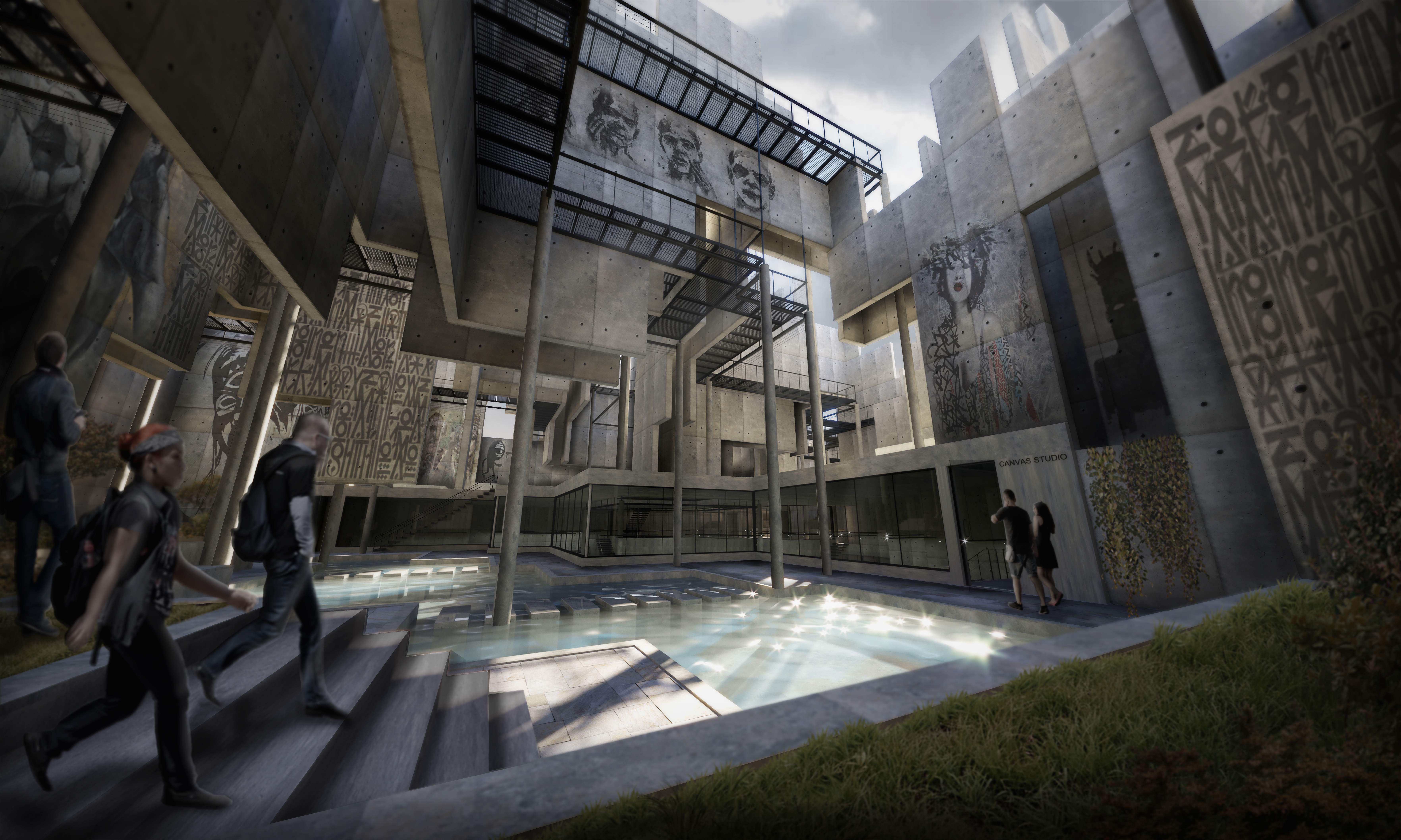 Visualisation from my 3rd year in Part 1 Architecture. Artists heaven within Berlin, intricate outdoor space made up of tall concrete structures designed to be used as canvases, with art studio basement making the centre point.