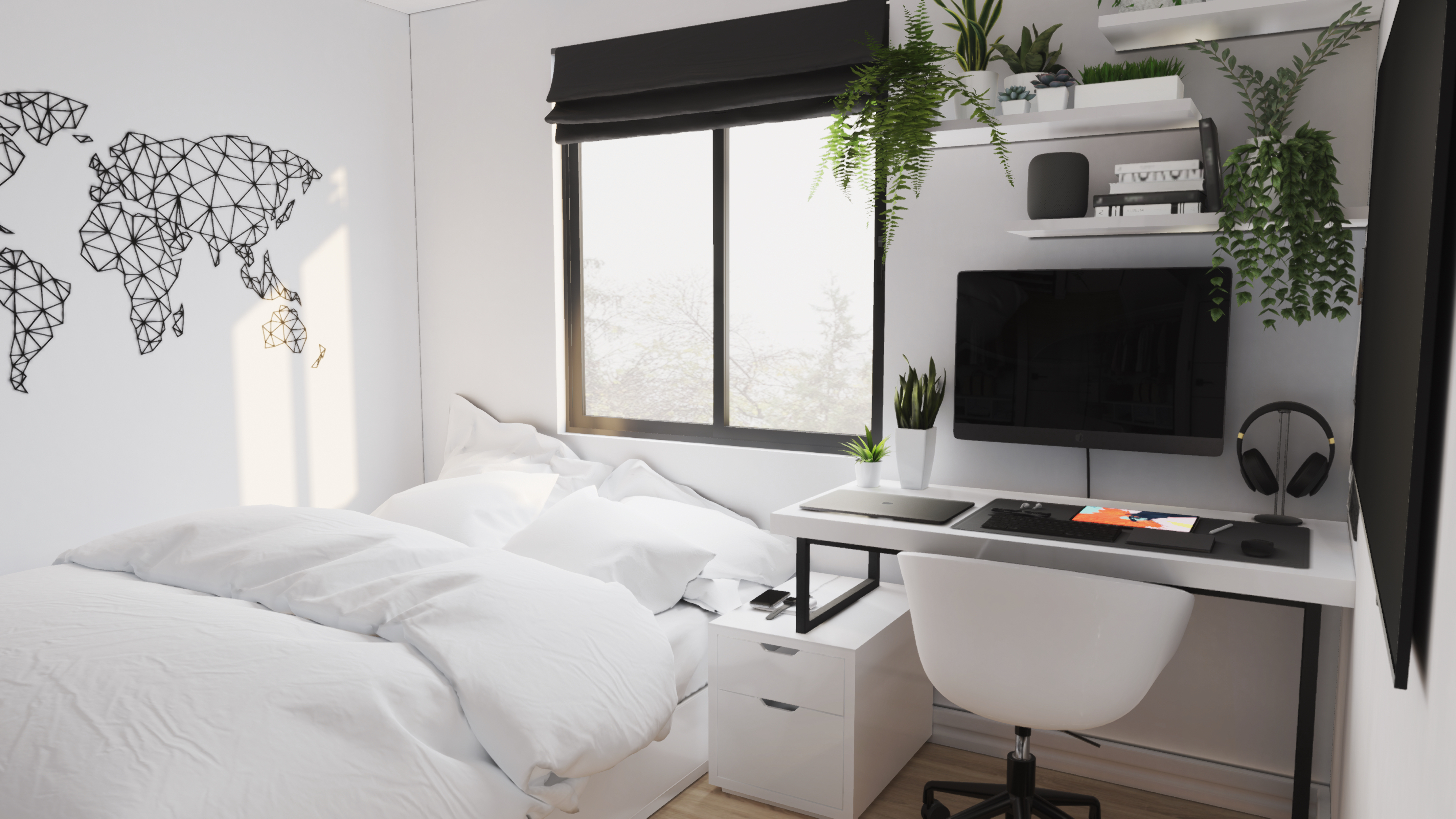 Interior bedroom rendering inspired by minimalism and scandinavian design.