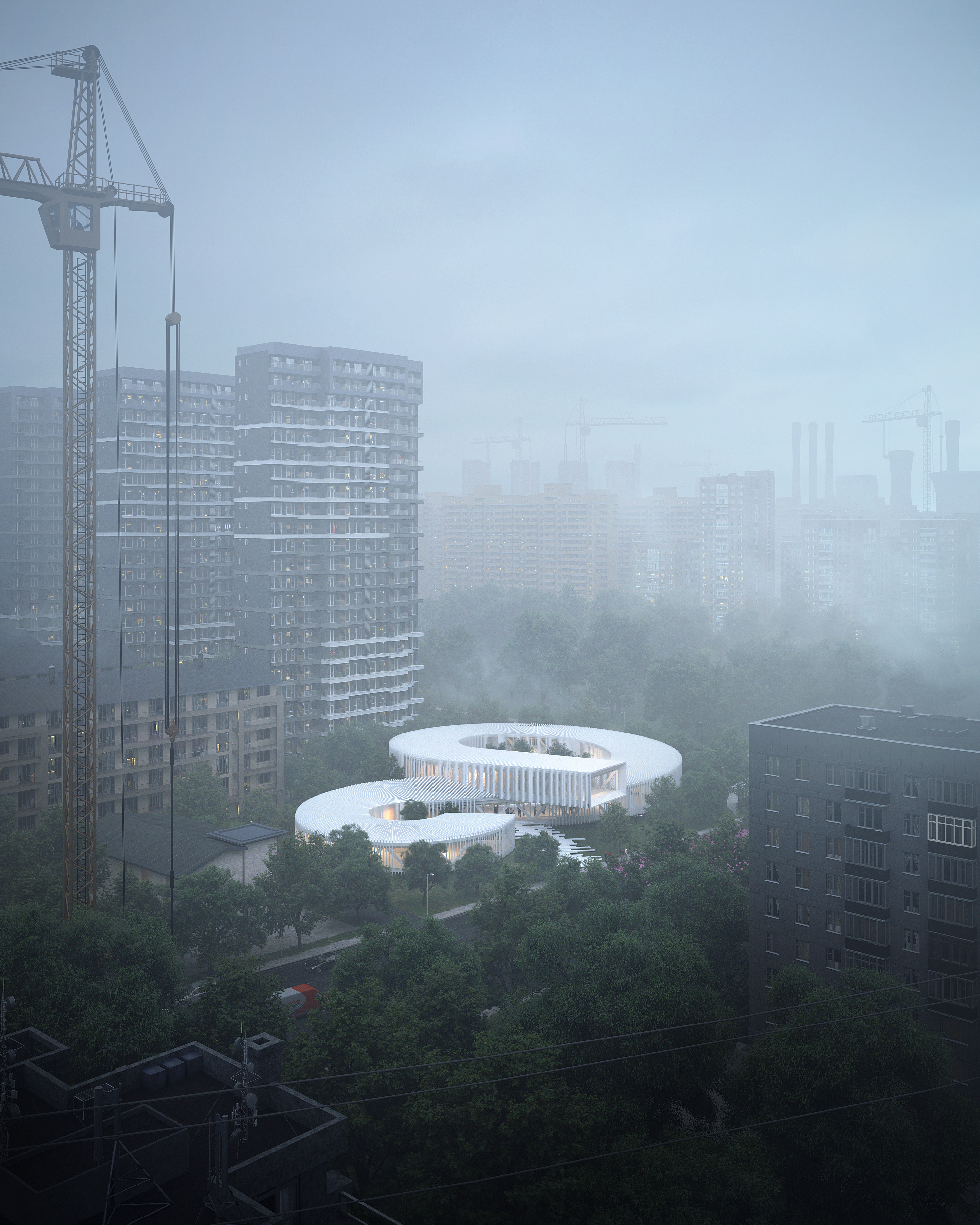 China is always under construcion. The new Baisha Kindergarden will be a singluar white gem surrounded by extra tall housing blocks in a highly populated area in the outskirt of Zhengzhou. The goal of this image was to showcase the project within its dense built environment, trying to imagine the actual situation, without any pictures nor google maps. A dynamic calmness, under construction.