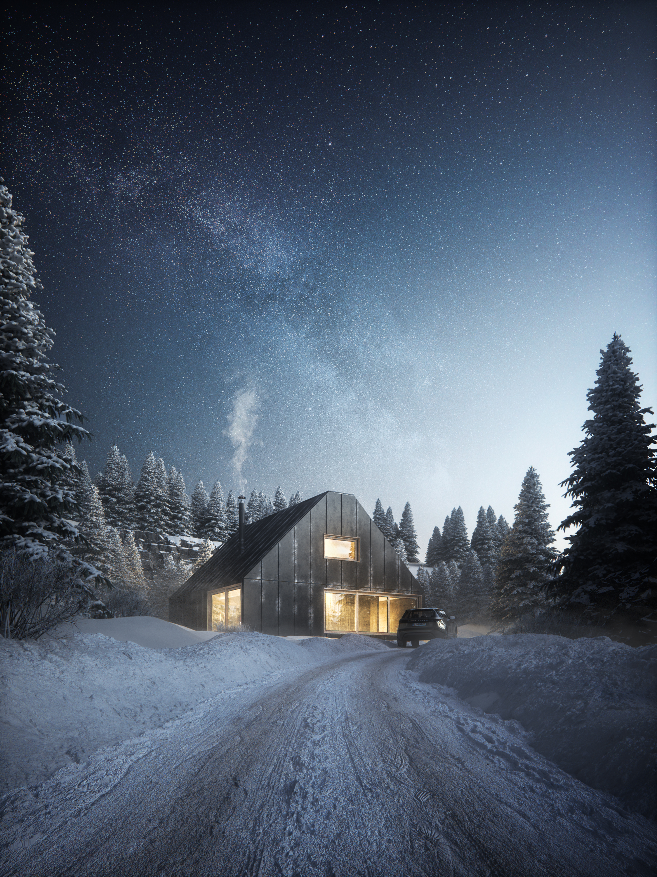 Here I wanted to create something with a warm feeling and cold but beautiful surroundings.