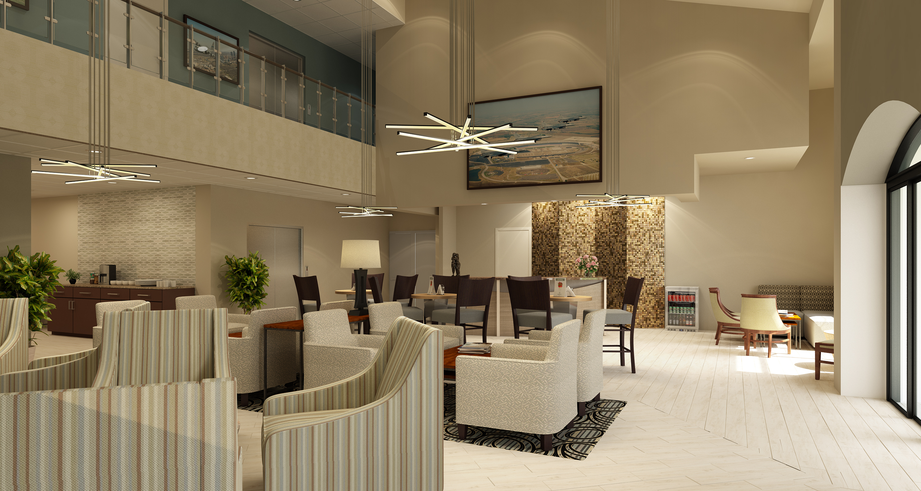 An expansive lobby with lounge seating and a small cafeteria. The double height ceiling adds to the beauty with the dangling light fitting.