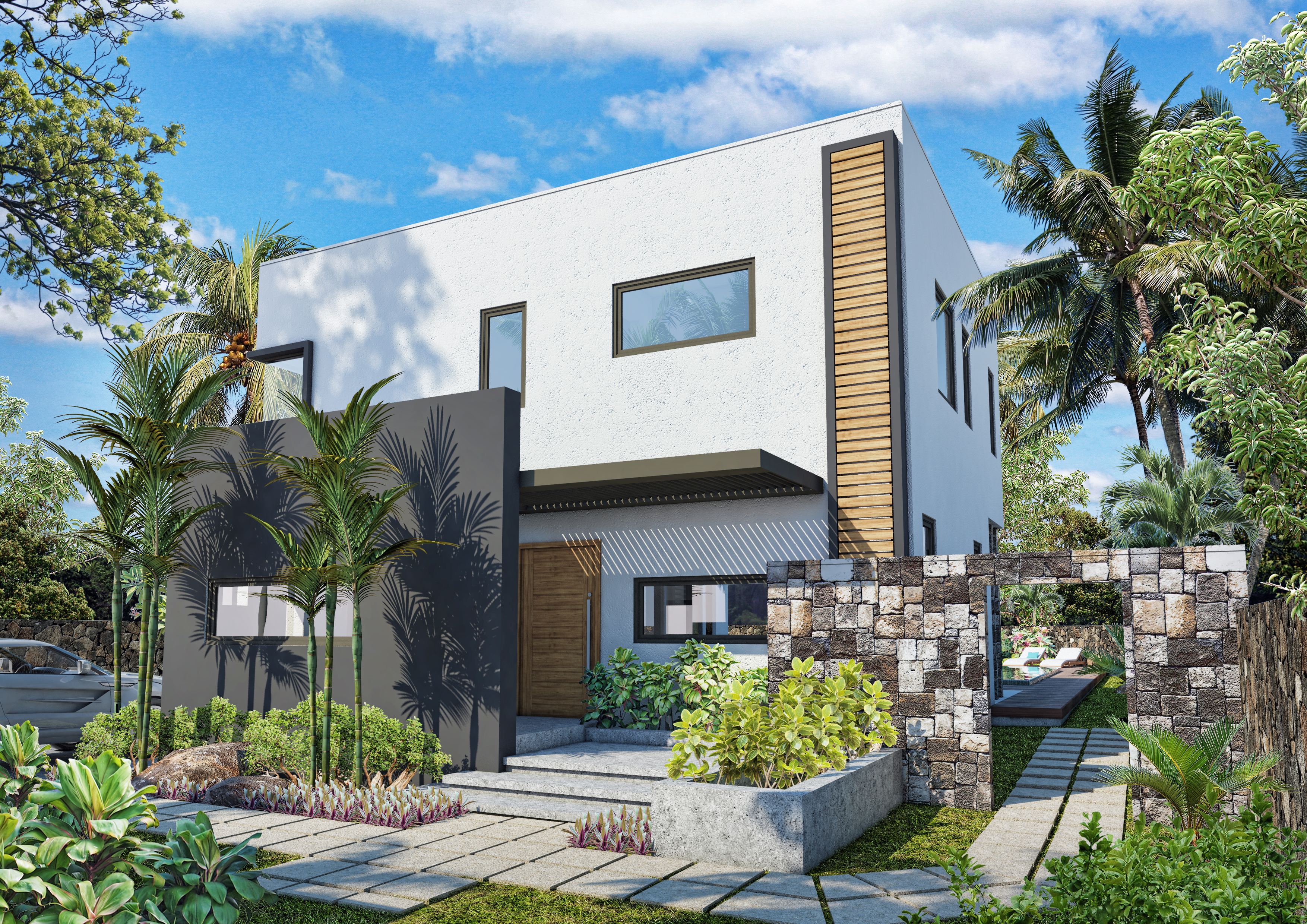 This is the main entrance view of a private residential house, in Mauritius.