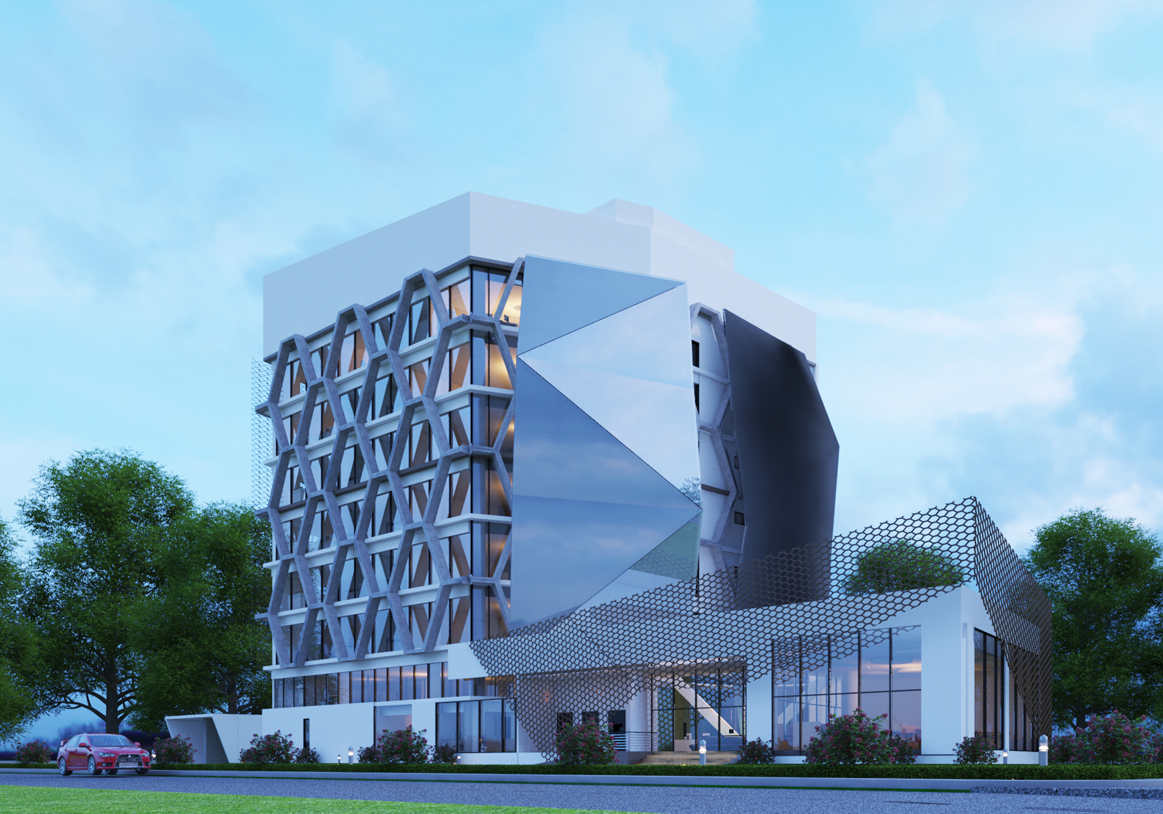 Biomimetic extrapolation from honeycomb to create a conducive living workspace.