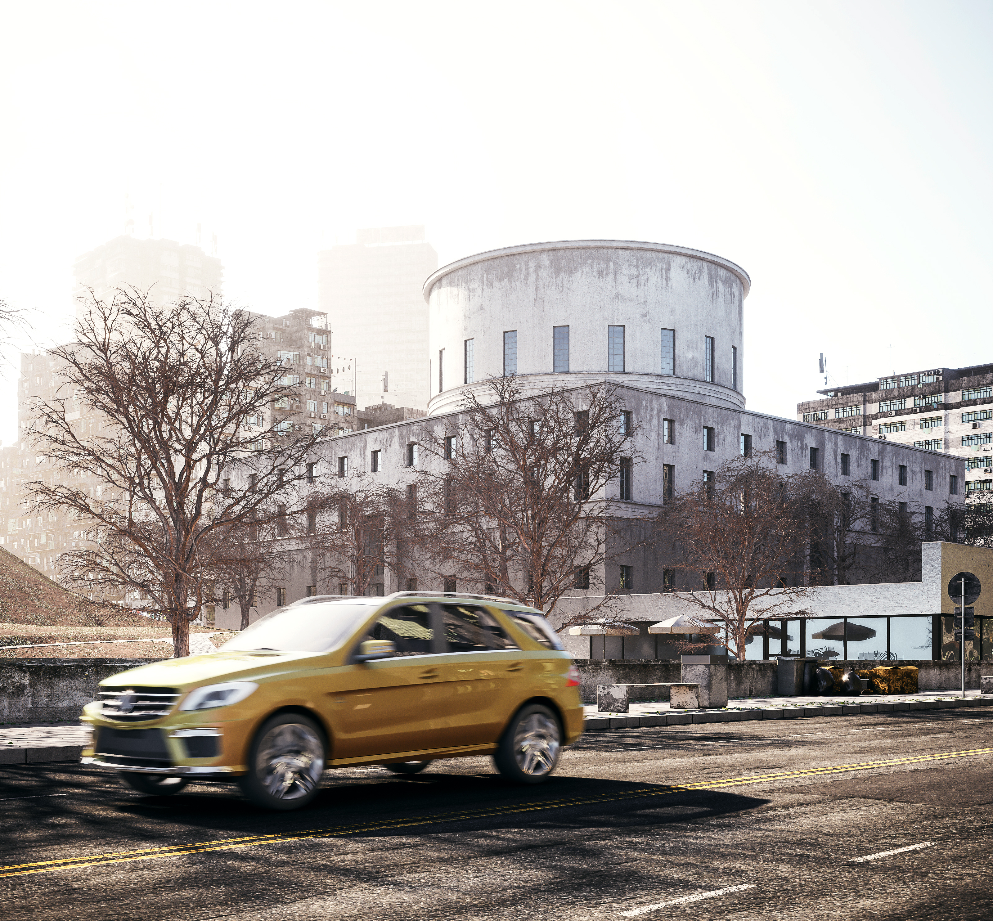 In this image, I capture this building in a far away future, where the whole surrounding have been replaced by high uncharacteristic skyscrapers. Although the library appears to have been renovated in an effort to merge it with the nearby style, its uniqueness is obvious.