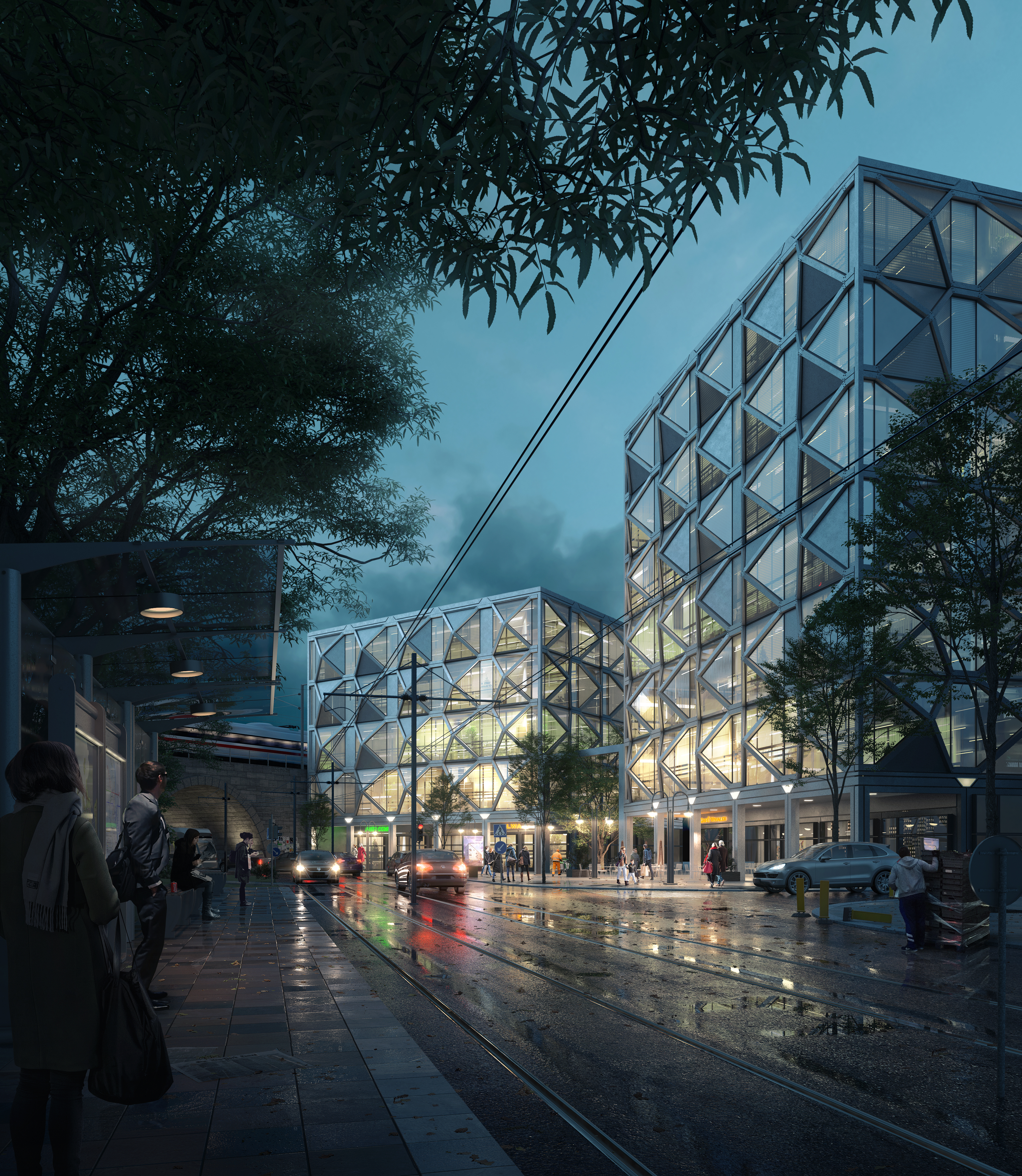 My own design concept for an office building, captured on a dark and rainy evening.