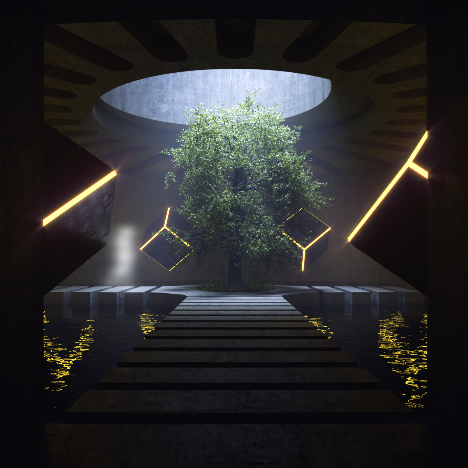 As you can see, there is a tree in a concrete temple around its bright cubes, which is the protector of the tree and the spirit that is the guard of the tree and the temple so that no one can destroy the tree.