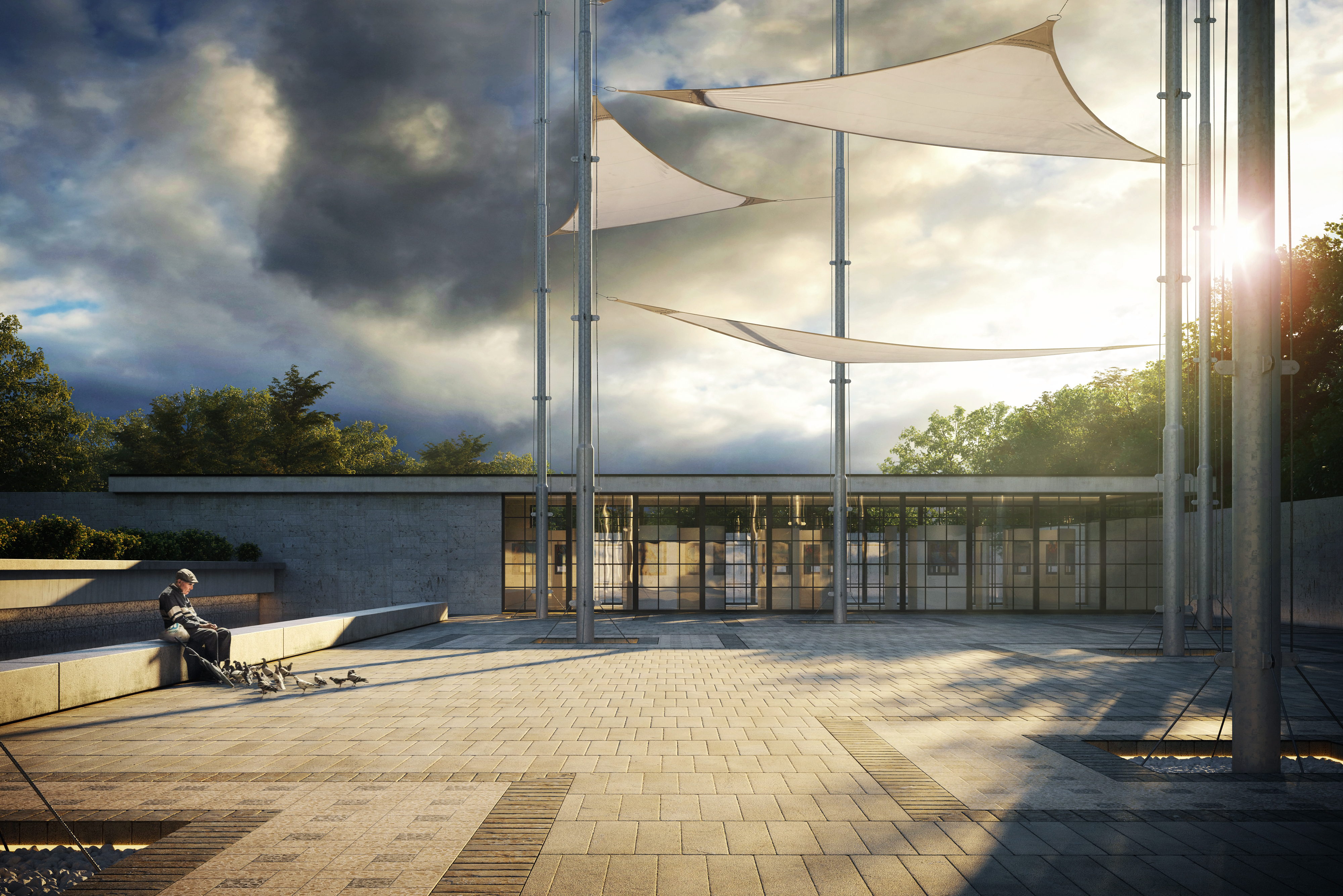 The crossing horizontal and vertical compositional elements and the directionality given by the position of the hero cutout and the sun aim to make the viewer go through the whole image from the lower left to the upper right, discovering the story first, then focusing on the architecture and lastly on the context/surroundings.