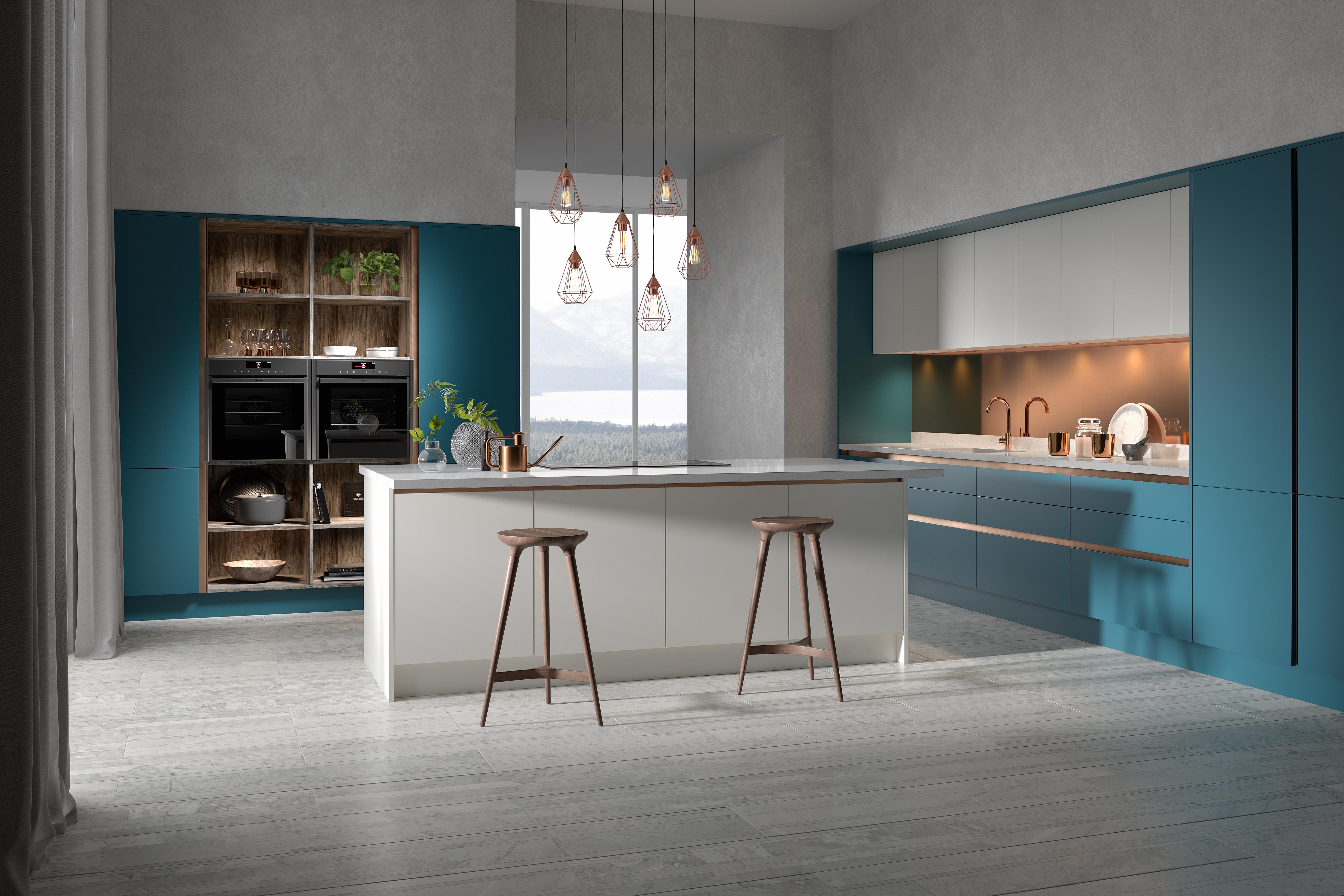 Our client wanted to make a statement with this kitchen by using their smooth slab door in a vibrant blue. Our stylists contrasted this with gola brushed copper rails and accessories, a mirrored backsplash and used marble floors and marble worksurfaces for a luxurious but minimal result.