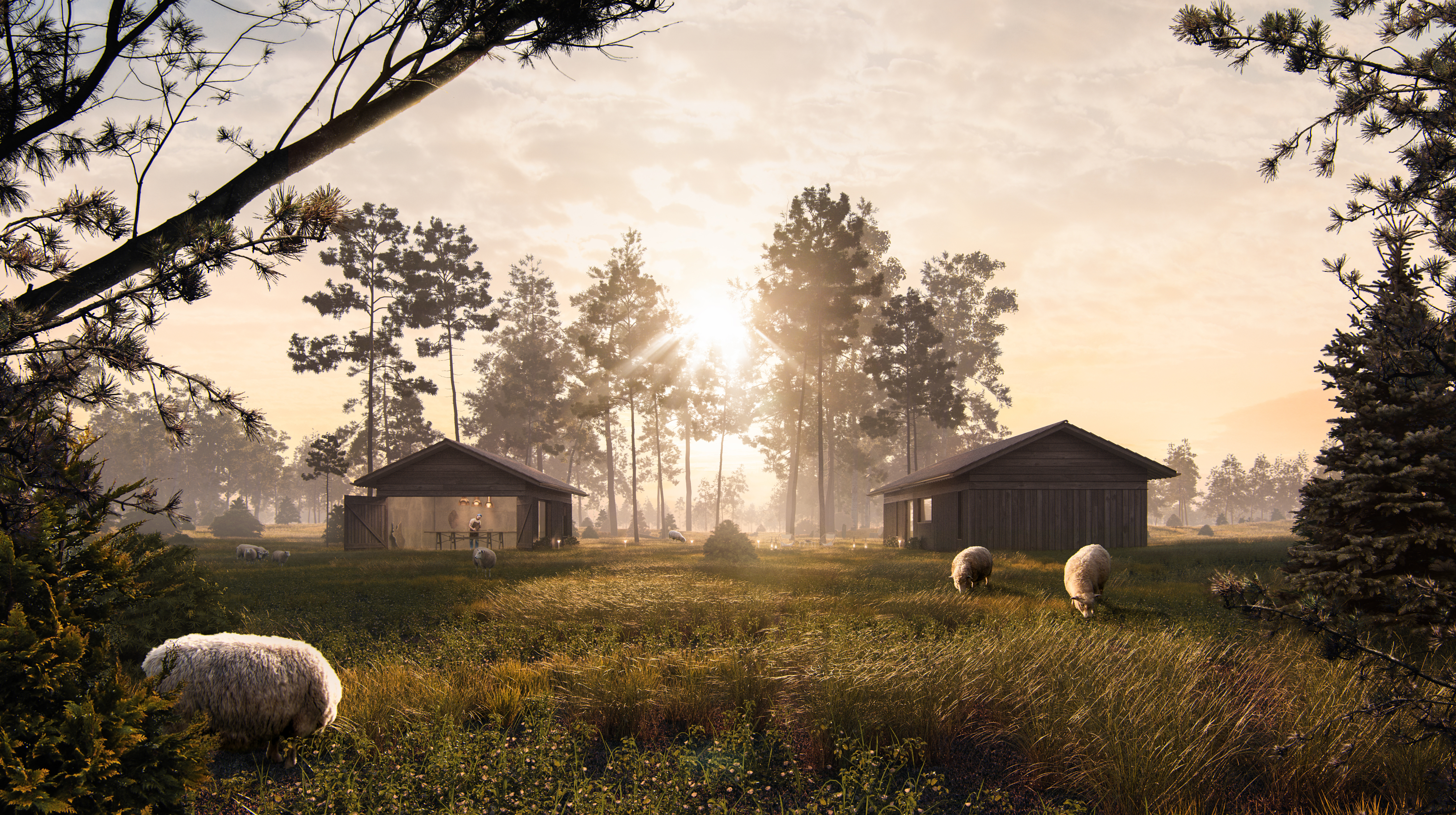 The image shows two buildings - private House on the right and a Workshop on the left, surrounded with beautiful french landscape.